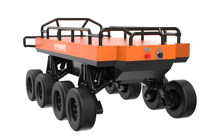 為應(yīng)對(duì)野外山地、叢林、泥濘等非結(jié)構(gòu)化地形,采用8輪與獨(dú)立懸掛的輪式底盤(pán),平穩(wěn)適配崎嶇場(chǎng)地,穩(wěn)定穿越 陡坡、臺(tái)階、沙石地等,彌補(bǔ)輪式機(jī)器人在復(fù)雜地形的短板。同時(shí)可在 - 20℃至 50℃的寬溫區(qū)間穩(wěn)定作業(yè)。