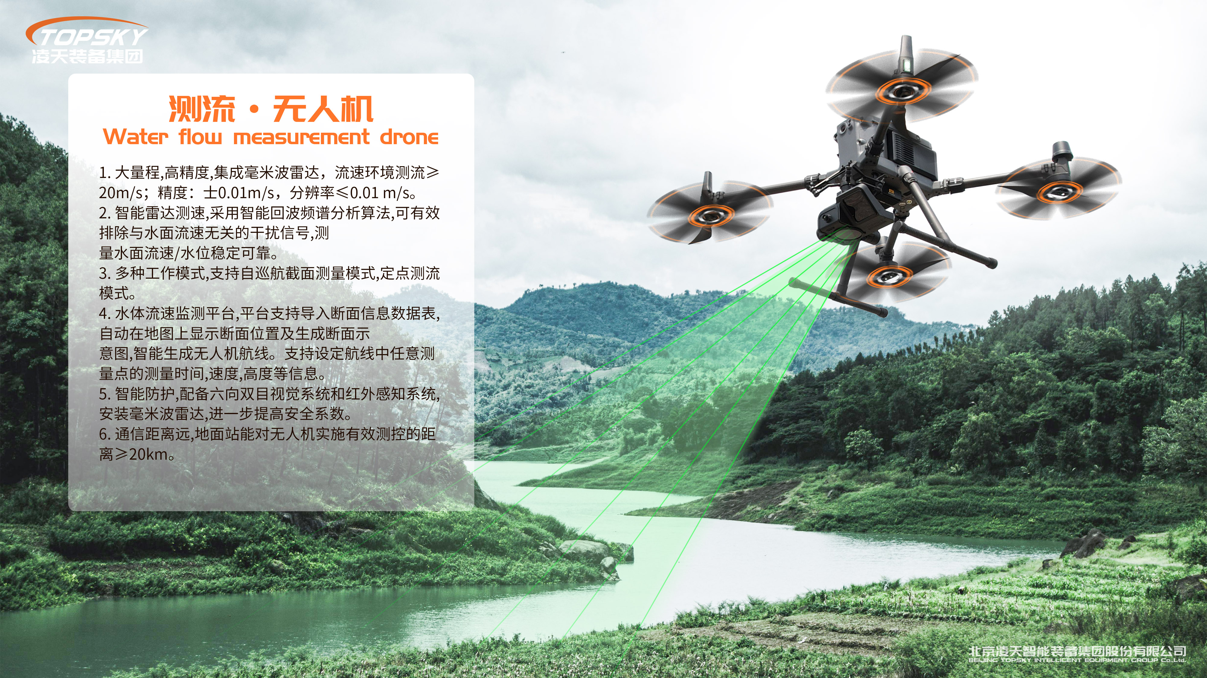 測流無人機具備水體流速、流量監測等系統;用于暴雨洪水流動速度,特別是堤防潰口水流速度的快速探測。具備無人機水體流速、流量的監測系統,流速環境測流≥20m/s。