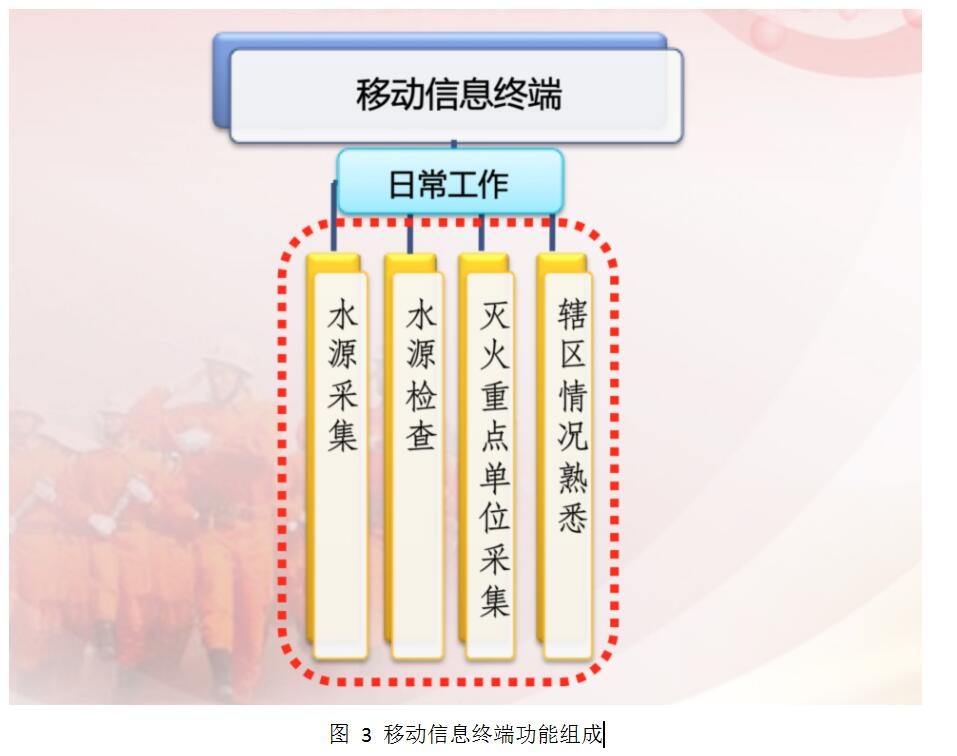 移動(dòng)信息終端作為日常工作中中隊(duì)指揮員、戰(zhàn)士的信息采集工具,主要包括水源采集、水源檢查、滅火重點(diǎn)單位采集以及轄區(qū)情況熟悉四部分功能,功能組成如下圖所示: