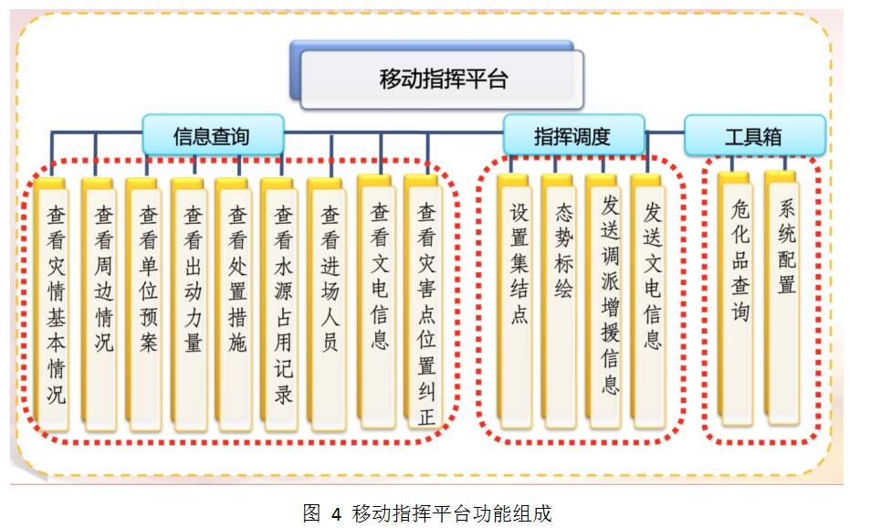移動(dòng)指揮平臺(tái)作為支隊(duì)及以上指揮員輔助指揮與決策的工具,主要包括信息查詢、指揮調(diào)度以及工具箱三部分功能。其中信息查詢主要包括查詢案件信息的相關(guān)功能,指揮調(diào)度主要包括發(fā)送指令的相關(guān)功能,工具箱包括危化品查詢和系統(tǒng)配置。移動(dòng)指揮平臺(tái)的功能組成如下圖所示:
