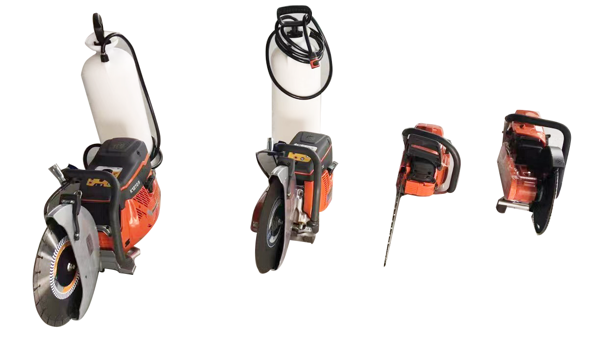 全功能切割鋸工具組主機由功率5.8KW的 PJR-K 1270R無齒鋸A兩臺、功率3.7KW的PJR-K770無齒鋸B兩臺、功率3.6KW的PJR-365X機動鏈鋸兩臺、功率4.1KW的PJR-S/ 115J機動雙輪異向切割鋸兩臺、以及鋸片,鏈條、冷卻水壺、火花塞、加油配比壺及其它附件組成。 |
