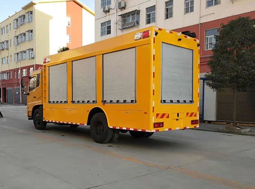 廂體外部鋼材為優(yōu)質(zhì)冷軋鋼板,內(nèi)襯優(yōu)質(zhì)冷軋鋼板折彎骨架,工藝先進(jìn),強度牢固。廂體為全密封結(jié)構(gòu),具備運輸、防雨、防腐、防火、防銹要求。車廂尾部安裝鋁合金卷簾門。發(fā)電機組進(jìn)排風(fēng)消聲處理,消聲器做降噪處理。車廂水泵兩側(cè)設(shè)開門,發(fā)電機進(jìn)風(fēng)口和排風(fēng)口防雨百葉窗,工作門下,尾部設(shè)有隱藏式抽拉梯,與車廂底板框架連接。