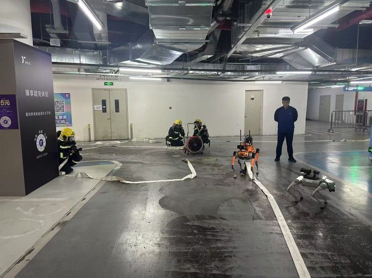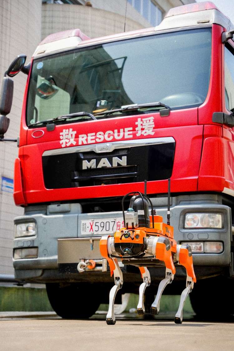 四足機器人搭載4D激光雷達,360°×90°半球超廣角感知能力,超低盲點,可以做出跳躍、伸展、握手、高興、跳人、坐下等手勢; 內置長續航電池,滿足消防偵察救援需求。