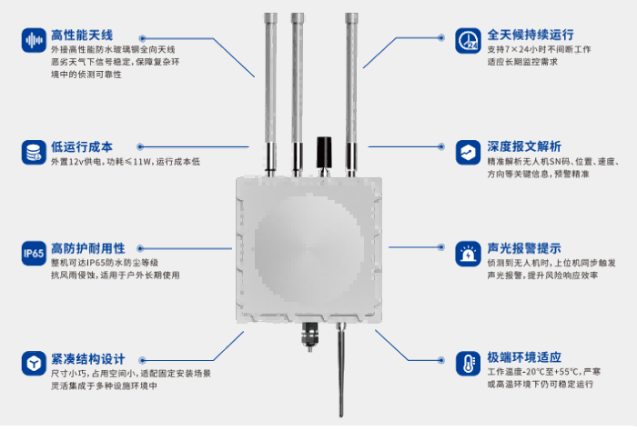 1.該產(chǎn)品是一款集成多種通信模式和能源供應(yīng)的智能無(wú)人機(jī)探測(cè)設(shè)備,采用外置玻璃鋼全向天線,可以對(duì)市面上常見(jiàn)消費(fèi)級(jí)無(wú)人機(jī)實(shí)現(xiàn)精準(zhǔn)預(yù)警;