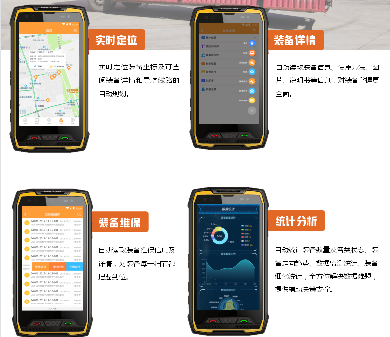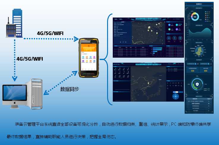 應(yīng)急消防裝備云管理平臺(tái)系統(tǒng)能夠直接通過職能人員手持的防爆終端,直接讀取系統(tǒng)內(nèi)所有的裝備、設(shè)備及具體的詳情、圖片、位置、傳輸?shù)臄?shù)據(jù),根據(jù)裝備具有特性進(jìn)行實(shí)時(shí)在線監(jiān)測(cè),當(dāng)監(jiān)測(cè)到的數(shù)據(jù)超標(biāo)時(shí),實(shí)時(shí)進(jìn)行報(bào)警及查閱報(bào)警信息。該平臺(tái)系統(tǒng)能夠結(jié)合智能防爆終端本身功能、北斗定位/GPS定位、錄像、拍照等進(jìn)行信息存儲(chǔ),隨時(shí)隨地查閱裝備庫(kù)、維修庫(kù)、報(bào)廢庫(kù)等級(jí)占比利用率分析,最終進(jìn)行數(shù)據(jù)統(tǒng)計(jì)分析處理。此外該系統(tǒng)支持本地化業(yè)務(wù)拓展,如:現(xiàn)場(chǎng)監(jiān)控、無線打印,保障此平臺(tái)系統(tǒng)在不同環(huán)境中的應(yīng)用與融合。