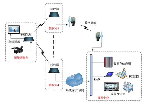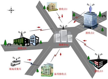 前端現(xiàn)場采集車安裝大功率車載設備在城市各區(qū)內巡邏,實時將采集的音視頻信息傳給就近接收點,接收點用微波、光纖或專網(wǎng)等設施傳輸給指揮中心。
